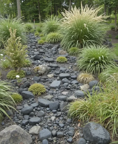 Create a rain garden with black rocks to manage water runoff while beautifying your yard. The rocks allow proper drainage and prevent flooding during heavy rains. Pair them with ornamental grasses and native plants for a sustainable design.
