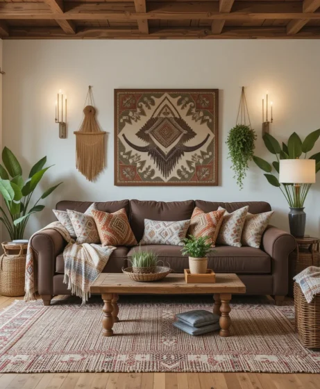 Incorporate patterned pillows, woven baskets, and hanging plants. Your brown couch anchors the eclectic, bohemian vibe.