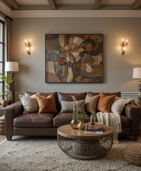 Add metal and wood accents such as a steel coffee table or rustic shelving. The brown couch blends perfectly with industrial décor elements.