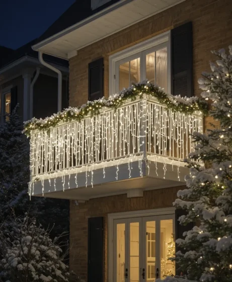 Hang icicle-style lights from the balcony edges to mimic falling snow. This adds a magical winter effect that draws attention and spreads cheer.