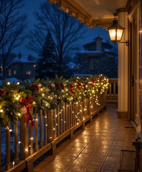 Wrap a garland with integrated lights around the railing or posts. The combination of greenery and twinkling lights adds classic holiday charm and warmth.