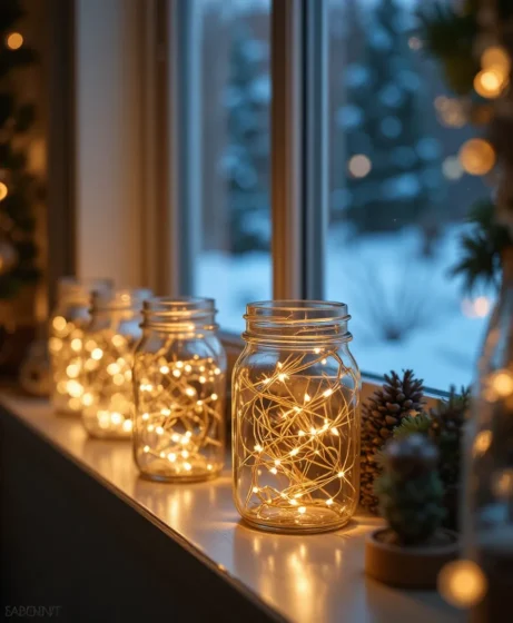 Fill mason jars with battery-operated string lights and place them on window sills. This DIY decoration adds charm, warmth, and festive sparkle.