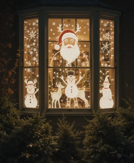 Add festive window clings like snowflakes or Santa scenes and illuminate them with string lights for a magical layered effect.