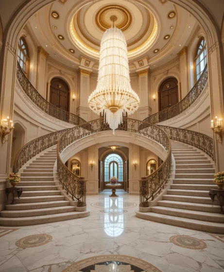 A large chandelier hanging above the curved staircase creates a breathtaking focal point that fills the vertical space of the foyer.