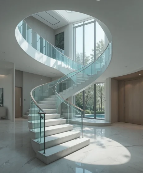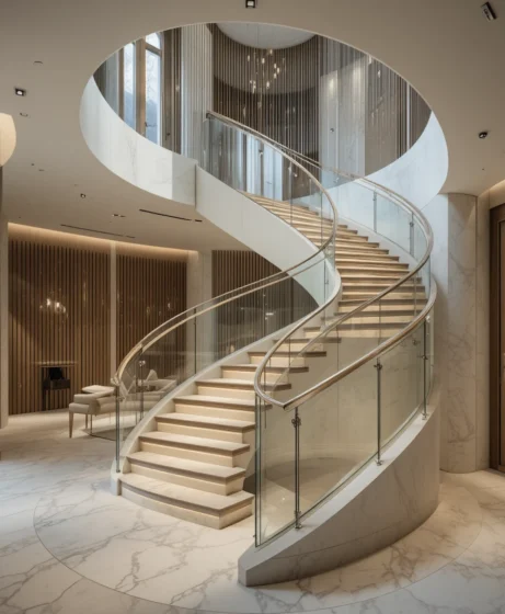 10. Curved Staircase With Glass Railings