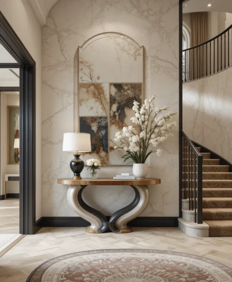 A curved or sculptural console table placed against the foyer wall complements the shape of the staircase. Styling it with decorative objects and soft lighting creates a polished and cohesive entryway design.
