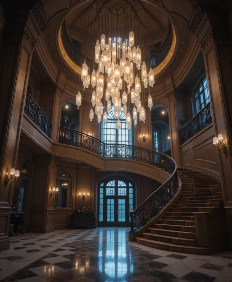 The cascading light reflects beautifully on the curved railings and staircase steps, making the entryway feel luxurious and dramatic.
