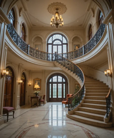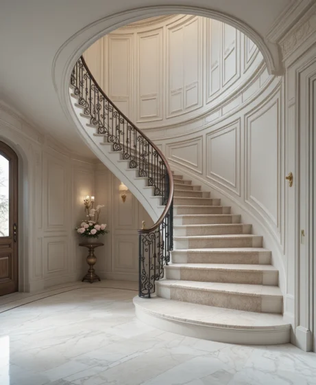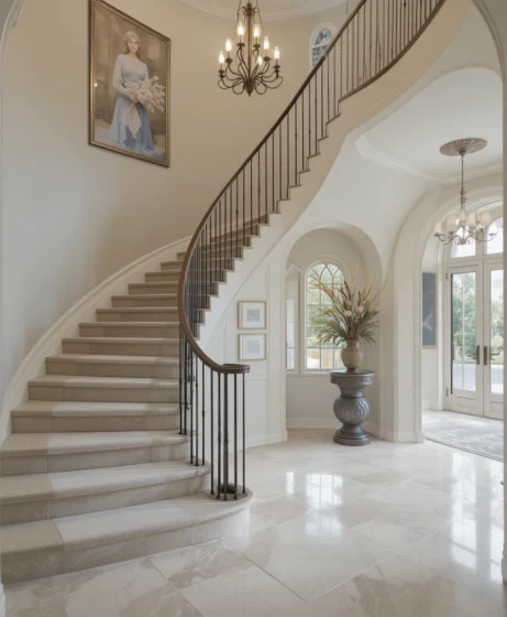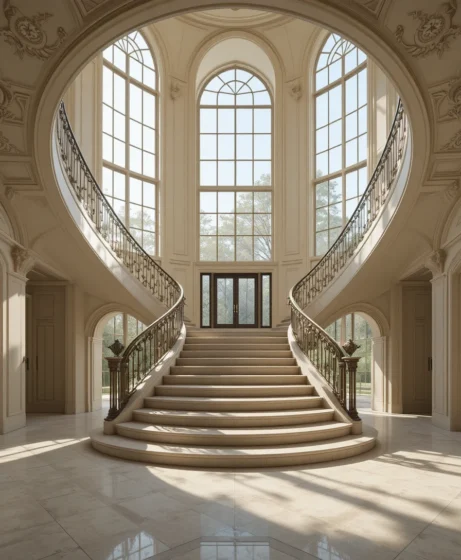 Using soft neutral tones like ivory, beige, and warm gray allows the curved staircase to remain the star of the entryway. Neutral colors also create a calm and sophisticated atmosphere.