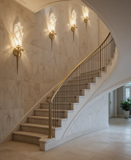 Install modern wall sconces along the curve of the staircase to create soft ambient lighting. These lights highlight the architectural shape while adding warmth to the space.