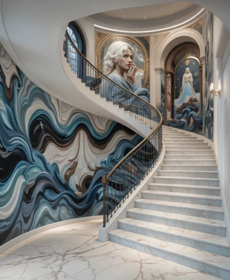 A large wall mural that follows the curve of the staircase wall can create a stunning visual effect. Abstract patterns, nature scenes, or textured wall finishes add artistic character.