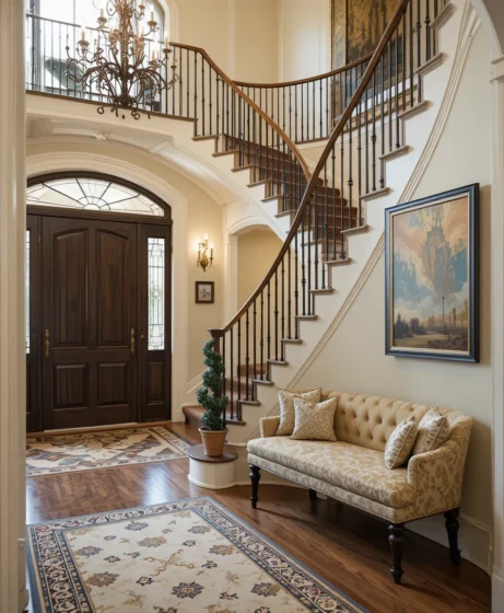 Elements like statement lighting, decorative consoles, greenery, artwork, and layered textures can enhance the beauty of the staircase while making the foyer feel warm and welcoming.
