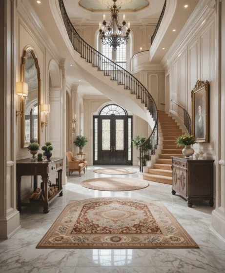 Adding soft area rugs near the entrance helps warm up the large foyer space. Rugs also define the entry area and create a welcoming feeling when guests arrive.