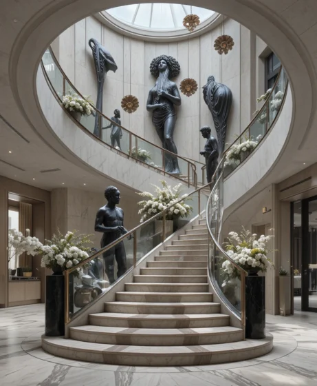 Placing large sculptural décor pieces near the staircase base creates a museum-like display that complements the architectural beauty of the curved design.