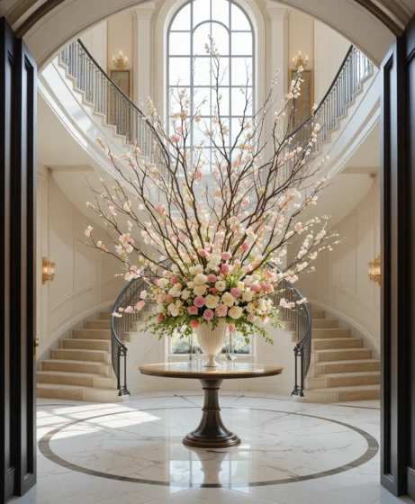 A large floral arrangement placed on a foyer table or pedestal can become the centerpiece of the entryway. Tall flowers or branches echo the height of the staircase and add natural beauty.