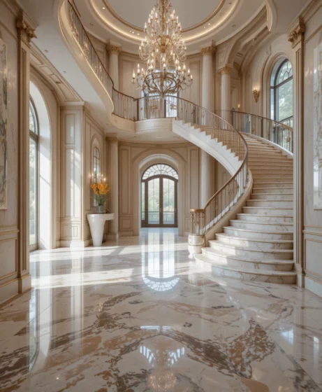 Installing polished marble flooring in the foyer enhances the elegance of a curved staircase. The reflective surface adds brightness to the entryway and complements the grand architectural style often found in large foyer spaces.