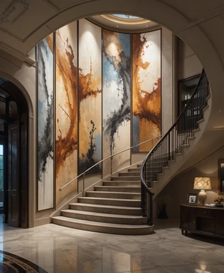 Large oversized artwork placed along the curved staircase wall creates a gallery-style display. Abstract paintings, modern sculptures, or classic framed pieces help fill the vertical wall space while guiding the eye upward along the curve.