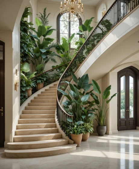 Large indoor plants such as fiddle leaf figs, palms, or olive trees placed near the staircase add freshness and life to the entryway. The greenery softens the strong architectural lines and makes the space feel welcoming.