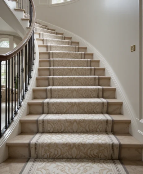 A long patterned runner following the curve of the staircase adds texture and color to the foyer. Soft neutral tones create elegance, while bold patterns bring personality and style.