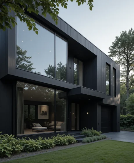 Imagine a sleek two-story house with charcoal siding, large black-framed windows, and a flat roofline.