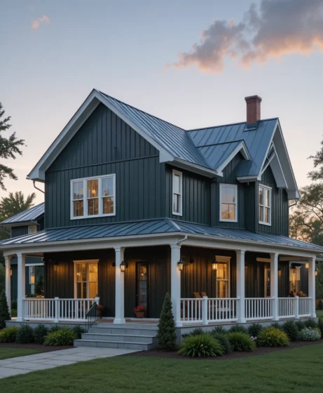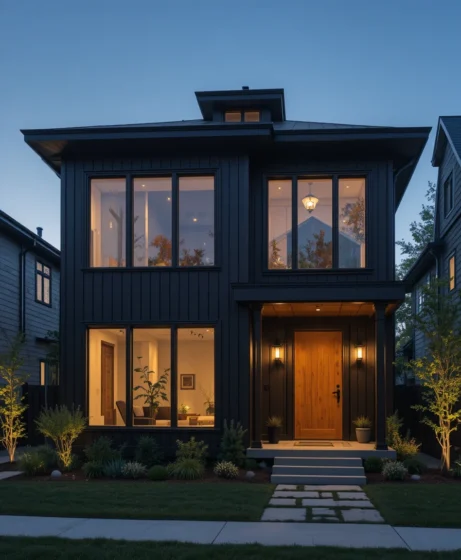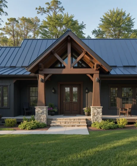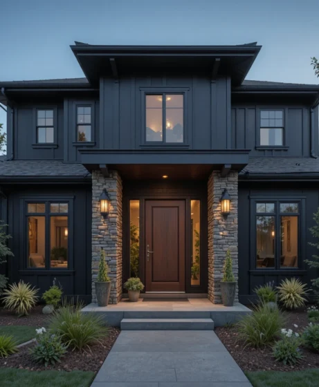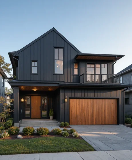 By combining dark colors with natural wood accents, stone textures, metal roofing, and thoughtful landscaping, homeowners can create a balanced and visually striking exterior.