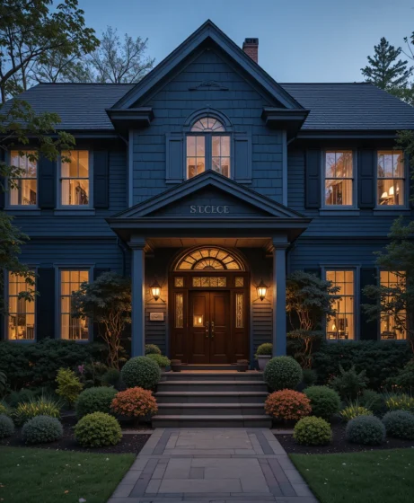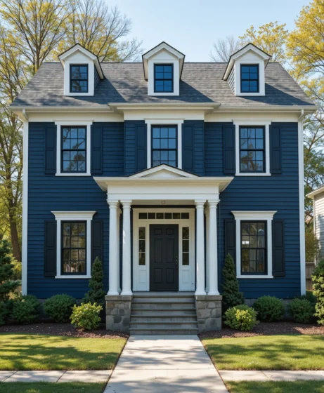 A deep navy blue house exterior offers a rich and timeless alternative to traditional colors. Navy adds depth while still maintaining a classic elegance.