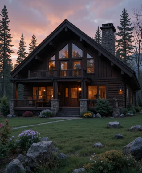 Picture a cabin-style house with rich brown wood planks, large windows, and a stone chimney. Warm outdoor lights glowing against the dark wood create a cozy evening ambiance.