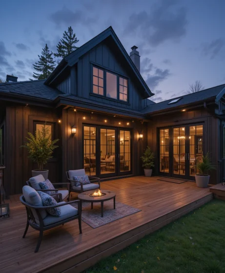 Imagine outdoor seating, string lights, and planters decorating the deck area. The wood adds warmth while the dark exterior maintains a bold modern appearance.