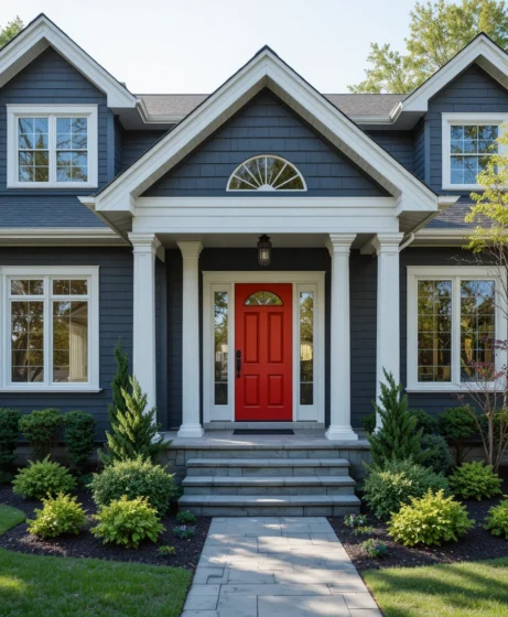 Adding a bright red front door to a dark gray house creates an eye-catching focal point.
