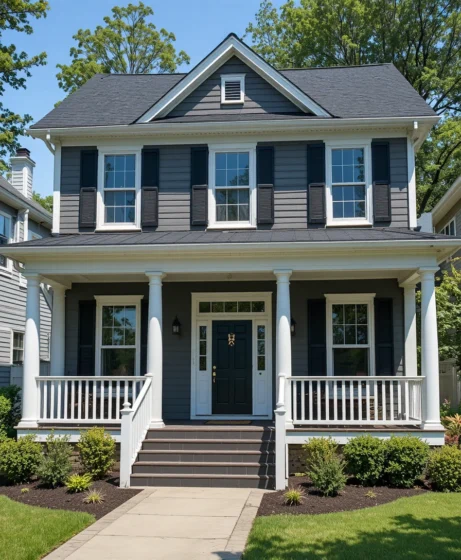 Picture a traditional two-story house with gray siding, white window frames, and a black roof. Decorative shutters and porch columns enhance the classic appearance.