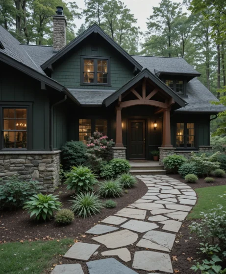 Picture a home surrounded by tall trees with deep green siding and cedar wood beams on the porch. Stone steps and natural landscaping further enhance the organic appearance of the exterior.