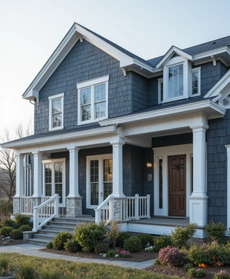 Imagine slate blue siding paired with white trim and brushed metal outdoor lighting. The soft contrast gives the home a clean and stylish look without feeling too bold.