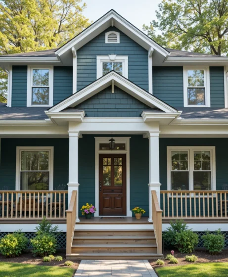 Picture teal siding with white window trim and natural wood porch railings. The color adds personality without overwhelming the design.