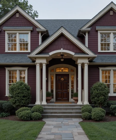 A dark burgundy exterior offers a rich and dramatic color choice that still feels warm and inviting. This shade works well with brick and wood accents.