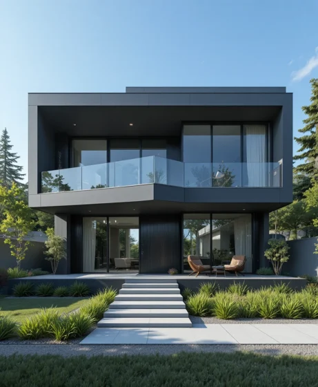 Imagine a contemporary house with tall windows, a glass balcony railing, and minimalist landscaping around the property.