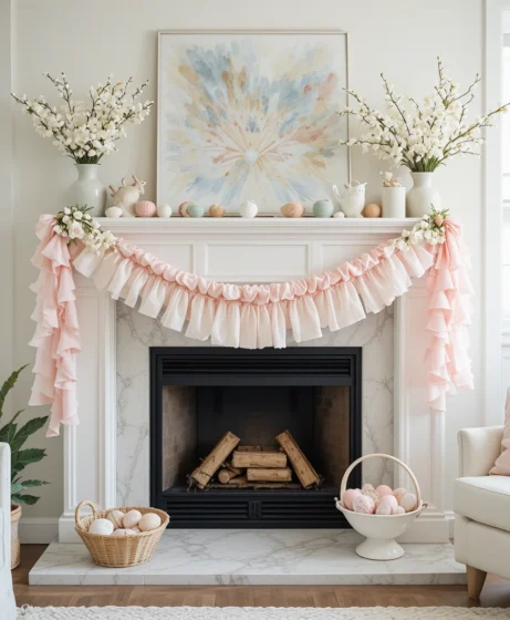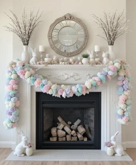 From soft pastel garlands to elegant floral arrangements and charming bunny accents, each idea helps transform your living space into a bright and welcoming spring retreat.