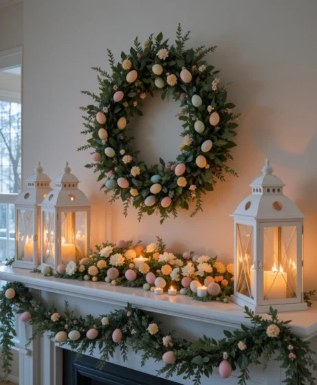 Place white lanterns with flameless candles on both ends of the mantel. Surround them with pastel egg accents and greenery garlands. The warm glow creates a cozy evening ambiance.