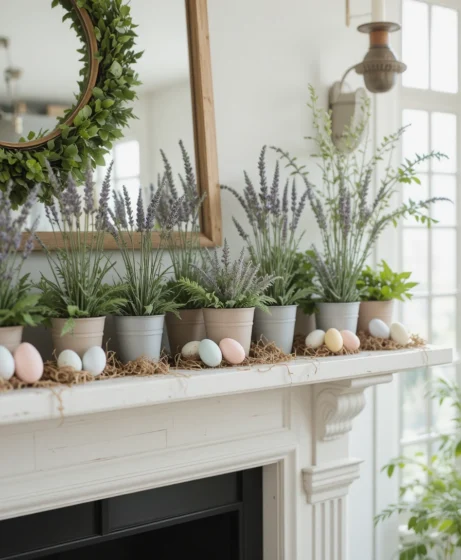 Use small potted plants like lavender or faux herbs lined neatly across the mantel. Add subtle Easter egg accents around the pots. The natural greenery brings life and freshness into your space.