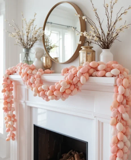 Create an ombre effect using decorative eggs arranged from light pink to deeper coral shades. Hang them in a flowing garland style. This colorful gradient gives the mantel a modern spring twist.