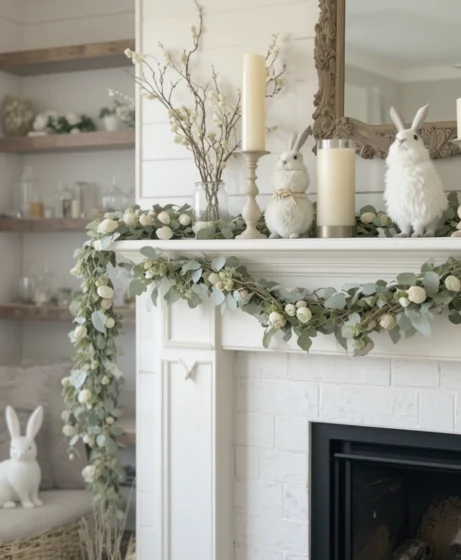Use cream-colored candles, sage green garlands, and soft white bunny accents. Keep the tones muted and calming. This modern farmhouse style feels peaceful and refined.