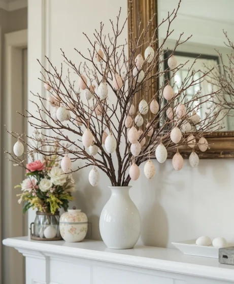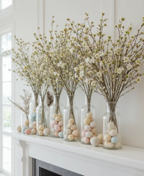 Fill tall glass vases with pastel speckled eggs and soft greenery stems. Position them at varying heights along the mantel. The combination of texture and color adds visual interest without overcrowding the space.