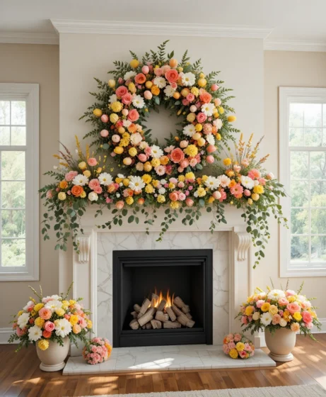 Hang a large floral wreath above the mantel filled with tulips, daisies, and eucalyptus leaves. Use bright yellow, coral, and soft pink blooms for a vibrant spring feel. Place small matching floral arrangements on both sides for a cohesive look.