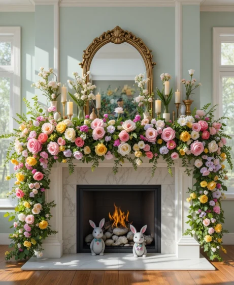 Create a lush floral garland overflowing with roses, peonies, daisies, and greenery. Let it cascade slightly over the sides of the mantel. Add subtle bunny figurines peeking through the flowers for a magical spring garden effect.