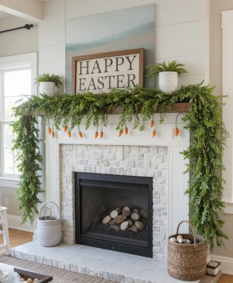 Lay a greenery garland across the mantel and tuck in small faux carrots tied with twine. Add rustic wooden signs with “Happy Easter” written in white lettering. This cozy farmhouse style feels playful yet charming.