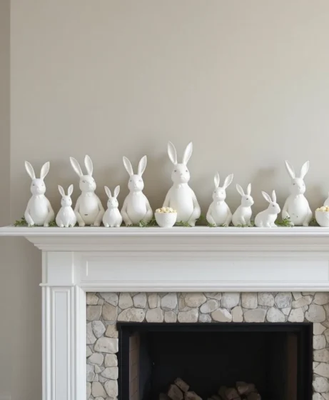 Arrange a collection of white ceramic bunnies in different sizes along the mantel. Add subtle greenery between each figurine to soften the display. The neutral palette keeps it clean and timeless.