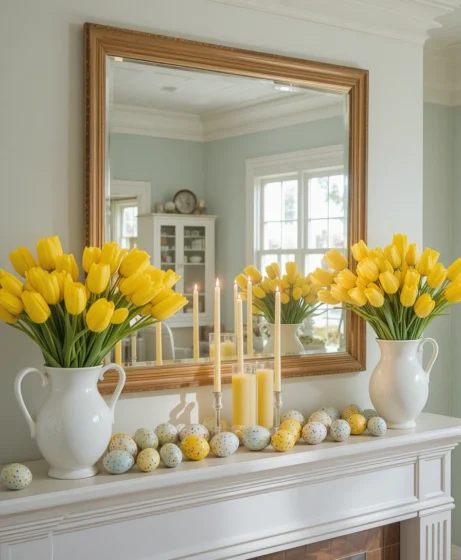 Use vibrant yellow tulips in tall white pitchers placed at both ends of the mantel. Add pastel candles in the center and small decorative eggs scattered between them. The cheerful yellow tones instantly brighten the room.