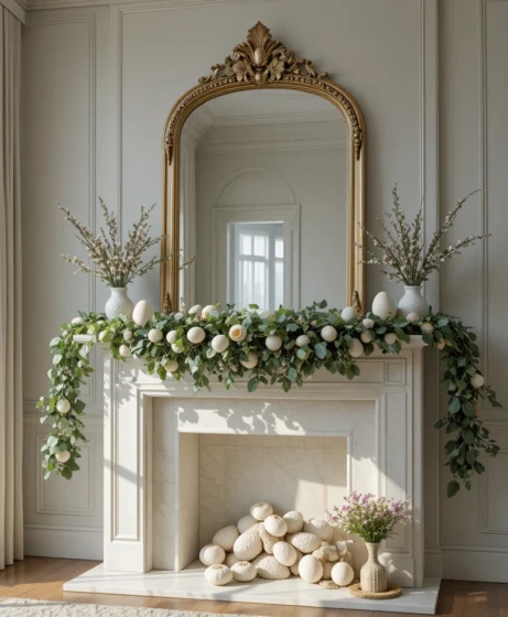 Lean a large decorative mirror against the wall above the mantel. Drape a thick eucalyptus garland around the frame. The reflection enhances natural light and makes pastel decorations pop beautifully.