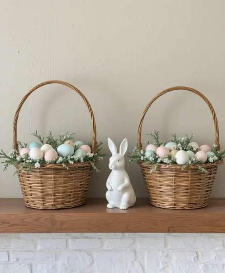 Place two small woven Easter baskets filled with pastel eggs and greenery on either side of the mantel. Add a bunny figurine in the center. The baskets add texture and a cozy, welcoming feel.