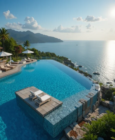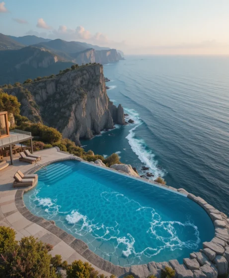 I love how a pool built on a cliff’s edge creates a dramatic effect. The water blends seamlessly with the ocean below. Adding a natural stone deck enhances the feeling of being connected to nature.
