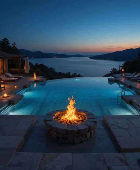 Incorporating fire pits or torches around the pool creates dramatic contrast. I love how firelight reflects on the water at night. It adds warmth and sophistication to the design.