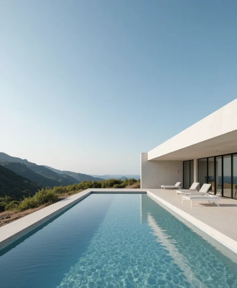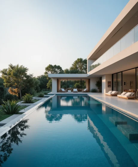 A long, narrow lap pool offers both exercise and aesthetic appeal. I imagine clear water with minimal decor. It’s perfect for homeowners who want beauty and functionality combined.
